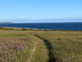 A large grassy field with a trail down to the water. The water of the bay is blue and there are clouds on the horizon