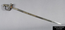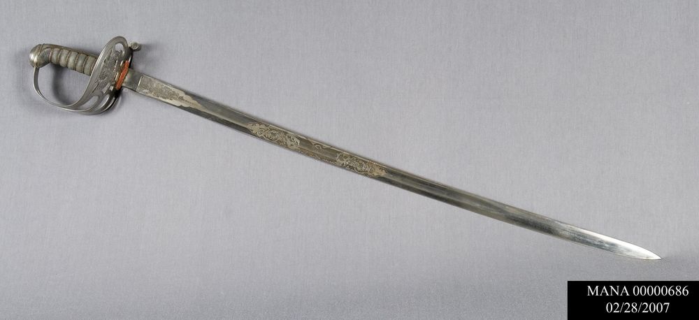 NON-REGULATION OFFICERS SWORD. ETCHED BLADE MARKED: "W. CLAUBERG/SOLINGEN" -AROUND ARMORED KNIGHT FIGURE (RICASSO), "IRON PROOF" (BLADE BACK); RED FELT GASKET. IRON MOUNTED HILT: HALF-BASKET GUARD WITH EAGLE OVER "US" SURMOUNTED BY "E PLURBUS UNUM"; WIRE WRAPPED FISH SKIN GRIP, IRON FERRULE & BACKSTRAP WITHOUT EARS. SCABBARD: CAT.# MANA 292.'