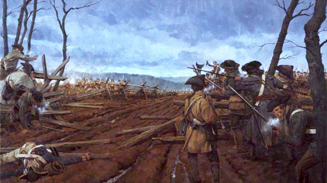 The beginning of the Battle of Guilford Courthouse from the perspective of the American first line drawn up behind a rail fence along the Great Salisbury Wagon Road