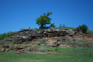 Leaning tree at Pawnee Rock; To travelers on the Santa Fe Trail, this sandstone citadel marked the halfway point of the trail and was one of the most prominent landmarks on their long journey. American Indians were said to have met at Pawnee Rock and reputedly used it as a vantage point to spot bison herds and approaching wagon trains. At times, travelers on the Santa Fe Trail regarded it as the most dangerous place they had to pass. However, it was also a welcome landmark for travelers, signaling that about half of their journey was now behind them. Hundreds stopped to write their names in the soft sandstone beside the ancient drawings that the Indians had engraved before.;