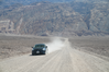 Natural Bridge road. A prius drives down a gravel road with a dust cloud trailing behind it. The road curves up and towards the base of the mountains in the background.
