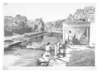 Scene depicts a drop-gate lock at Lock No. 6 (Magazine Lock) operated by a lock-keeper on the Chesapeake and Ohio Canal while a canaler in a canoe waits.