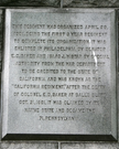 1 of 110 MN to PA. Dedicated 07/03/1886. Indicates position 71st PA Infty held 07/03/1863 at the Angle. Wall breached, LF & center retired to RF position. Located at Angle off Webb Rd. LF 114' S of MN. || Mn & 2 Flank Markers. Mn: fdn 6'1" sq, battered shaft, rough-cut/laid blocks, w/ polished tablets, bronze medallion. Cap cross gable, trefoil. Incised/excised inscrip/detailing. All 10'1"H. Markers: 1'sq x1'6"H. Cleaned, 1985-1987, tablet stained.