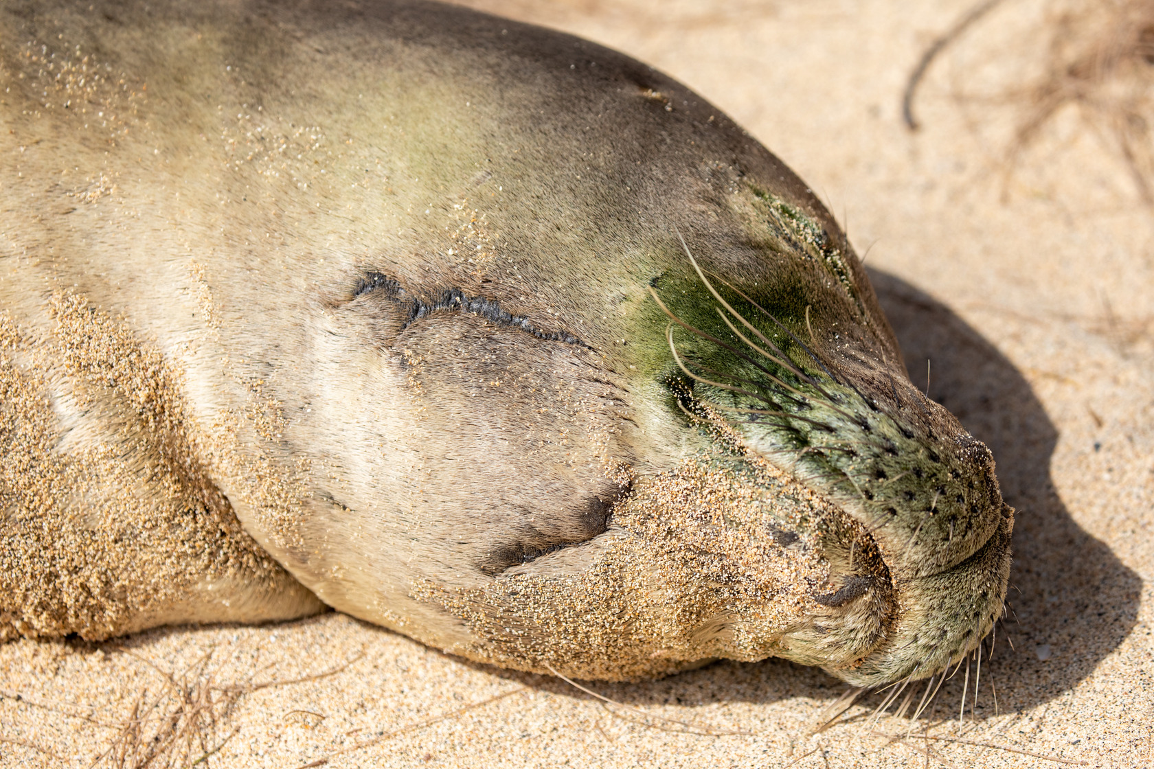A monk seal with a large U-shaped scar on their chin.
