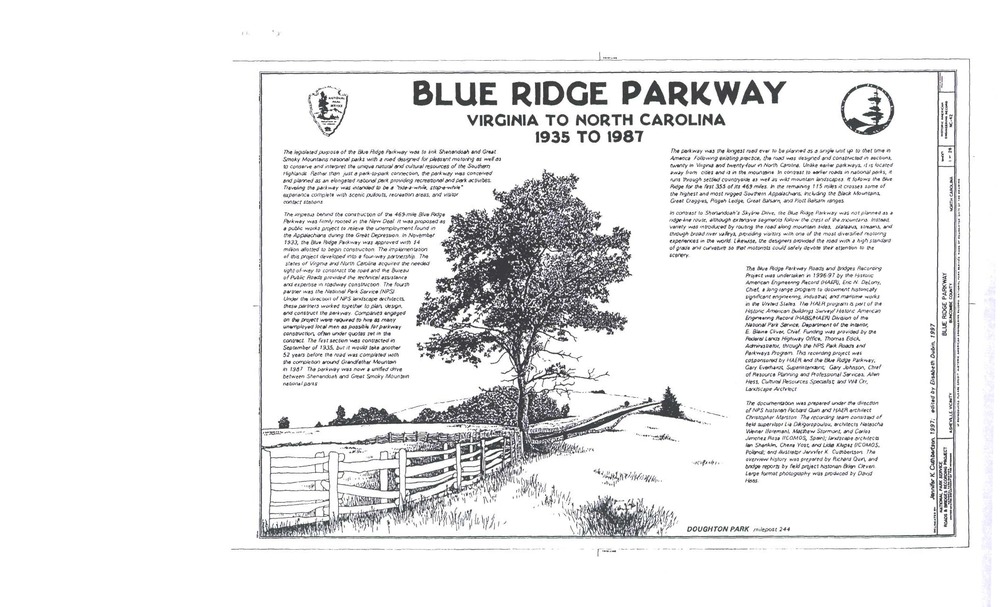 Drawing lists explanation behind the legislative purpose of the Blue Ridge Parkway, planning decisions, and the background of the Blue Ridge Parkway roads and Bridges Recording Project (1996-1997).