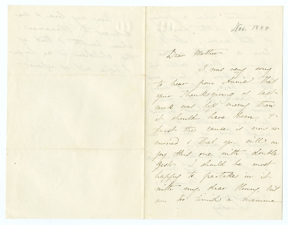 I was very sorry to hear from Annie that your Thanksgiving of last week was less merry than it should have been, & trust the cause is now removed, & that you will enjoy this one with double zest. I should be most happy to partake in it with my dear Henry, but am too timid a mamma [p. 2] to venture upon a journey with my little darling at this season. As I have so recently written Anne, - & Henry will supply whatever I have omitted, - I have nothing more, at present, to offer you than my tenderest wishes for your health - & as much love as can be conveyed in words –
