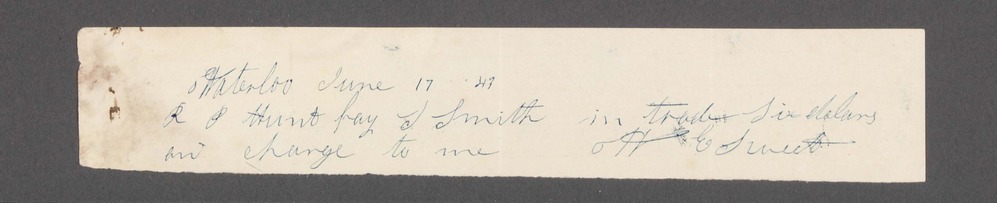 On front of document: "Waterloo June 17 43 R P Hunt pay S Smith in trade Six dolars and charge to me W E Sweet" On back of document: "W E Sweets order"