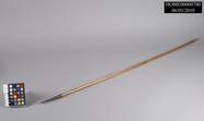 Arrow. Overall length 34" long. Metal point 3 1/2" long. Unusual in design. Is a cone of metal tapering to flat point to which shaft has been inserted. Seam of cone apparently has been hammer welded. No feathers attached. Crude shallow notch on back end of shaft.