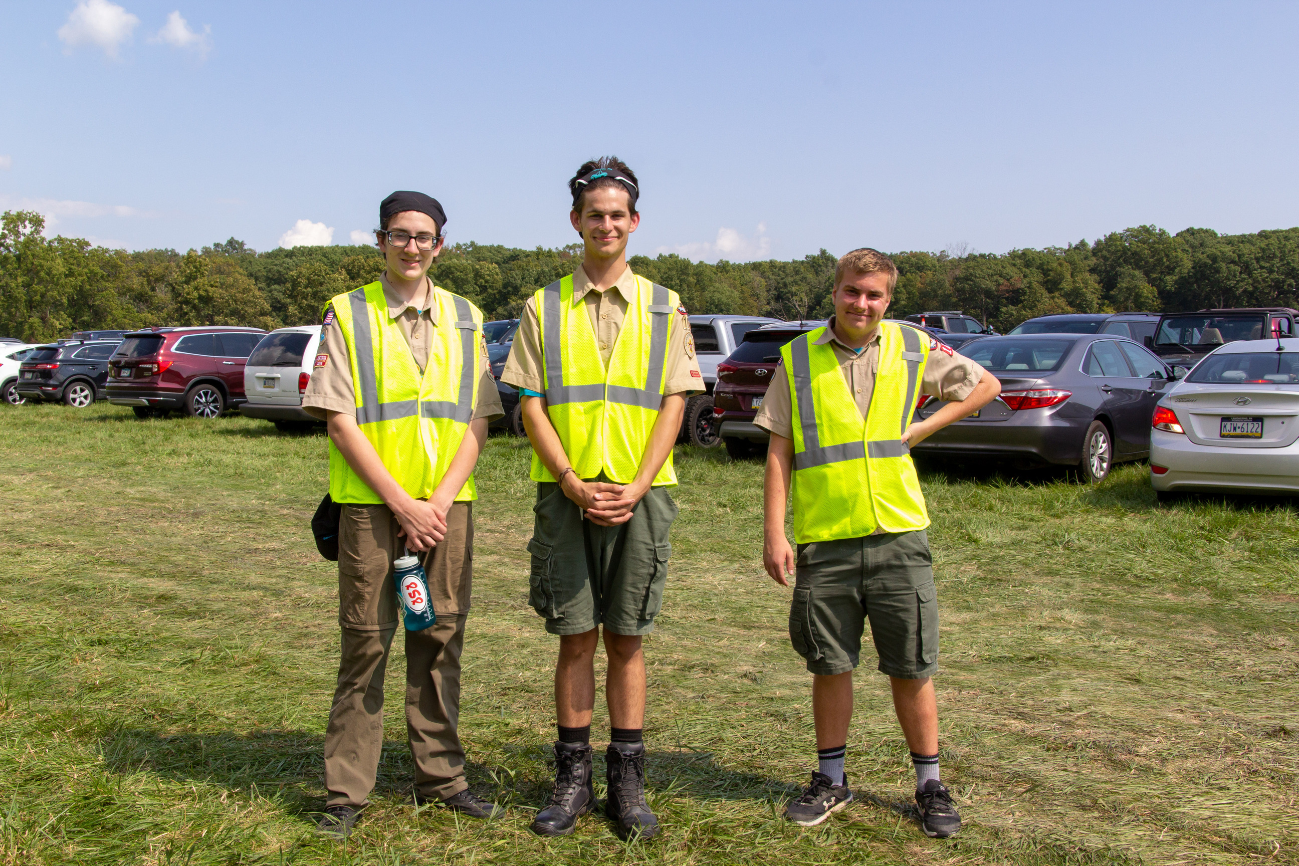 Three boy scouts wearing safety vests in a parking lot.