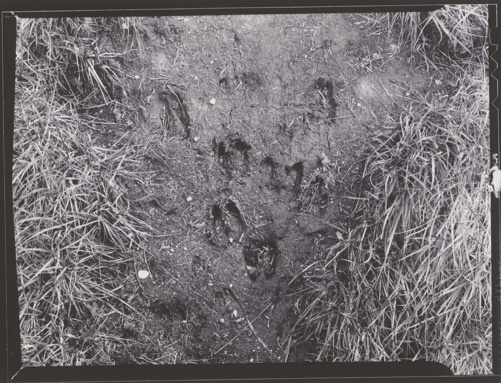 Dall sheep tracks in damp spot in trail, Ewe Creek. Negative #: 10,705. Locality: Mt. McKinley National Park [Denali National Park]. Location of Negative: Wildlife Division, Director’s Office. [This information comes from the reverse of the envelope for this negative number.]