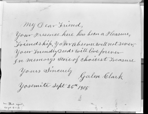 Autograph of Galen Clark (age 92 yrs.) in the autograph books of Nellie & Dorothy Atkinson. Copied courtesy Bonnie Douthit. Copied October 1980 by Michael Dixon.