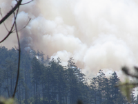 A slender but dark column of smoke rises on the left in front of a dense wall of smoke rising from a forested ridge.
