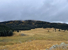 A mountain with conifer trees and golden aspens sits below a foggy sky. An amber colored grassy valley in the foreground is dotted with volcanic rock.