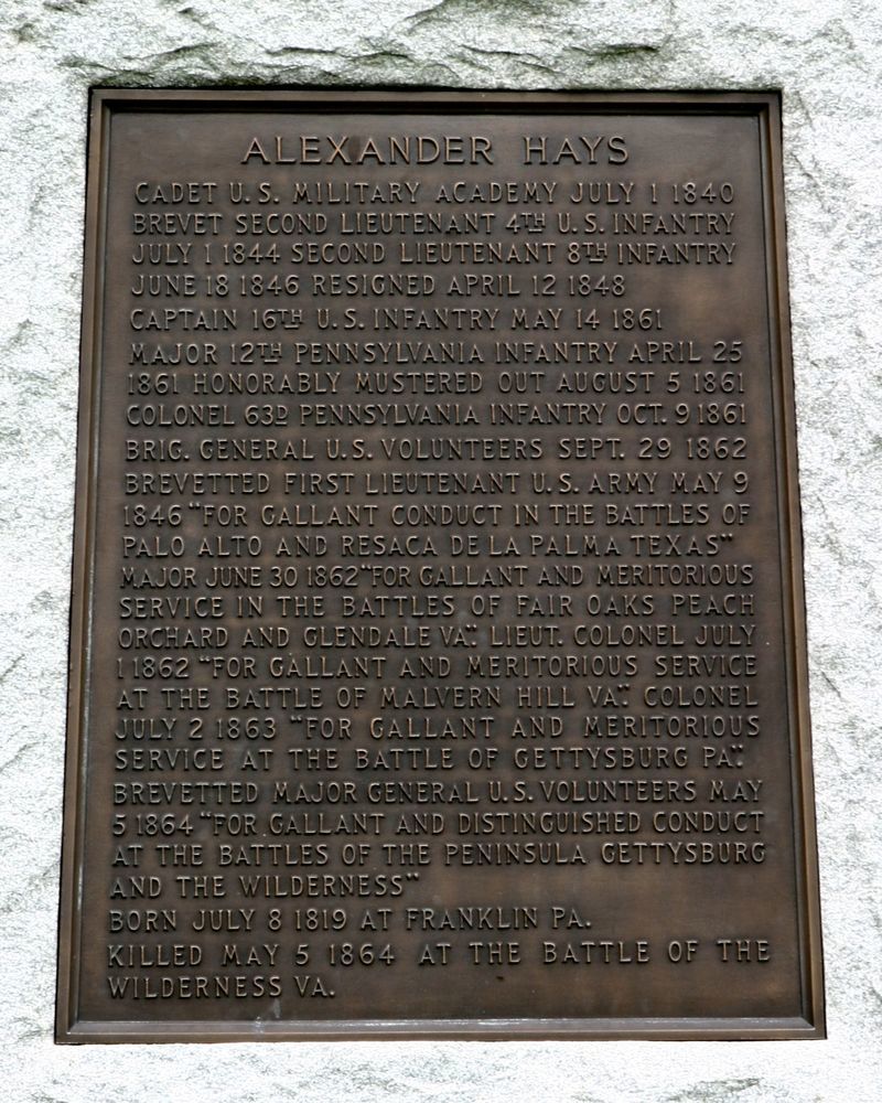 1 of 15 Monuments honoring Officers. Indicates general placement of Hays' Division line. Located approx 300' N of Brian Farm House, W side of Hancock in Ziegler Grove. || Mn, 6'10" sq base, 14'H, rough-cut, tooled edge shaft w/ 2'4"x3'11" tapered bronze tablet front, PA coat of arms reverse. Topped w/ bronze statue of General Hays. Erosion thru visitation at base.