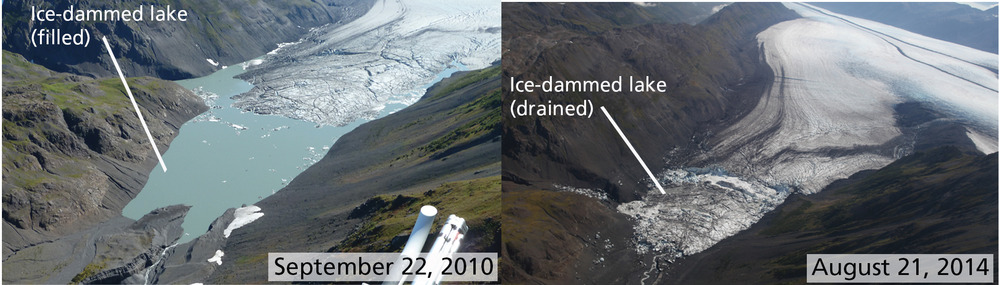 Photographs of the ice-dammed lake sourcing the Bear Glacier outburst floods. The left photo shows full