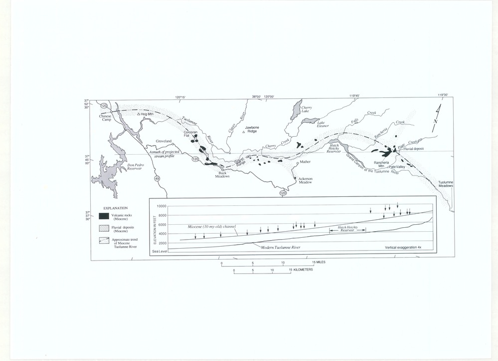 Map showing water features around Tuolumne river and elevation profile with edited data