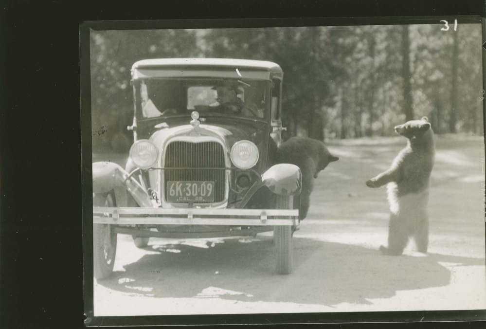 Two black bears begging. Locality: Yosemite National Park. Negative #: 31. Location of Negative: Region Four Headquarters. [The date and location come from the reverse of the envelope for this negative number.].
