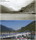 Photo pair shows thickening of vegetation on the slopes, alteration of the shoreline and tidal area by dredge and fill operations, as well as residential and commercial development and infrastructure improvements. View north of the Skagway waterfront area. Top photo of undeveloped waterfront area of Skagway was made July 26, 1897 by Frank La Roche. Bottom photo of the Skagway Small Boat Harbor was made August 15, 2013 by Ronald D. Karpilo, Jr. and Sarah C. Venator (NPS).