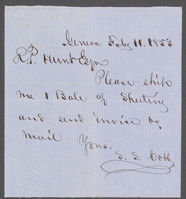 On front of document: “Geneva Feby 11 1853 R.P. Hunt Esq Please ship me 1 Bale of Sheeting and send invoice by mail Yours S.S. Cobb” On back of document: "S.S. Cobb Geneva 2mo 12th 53"