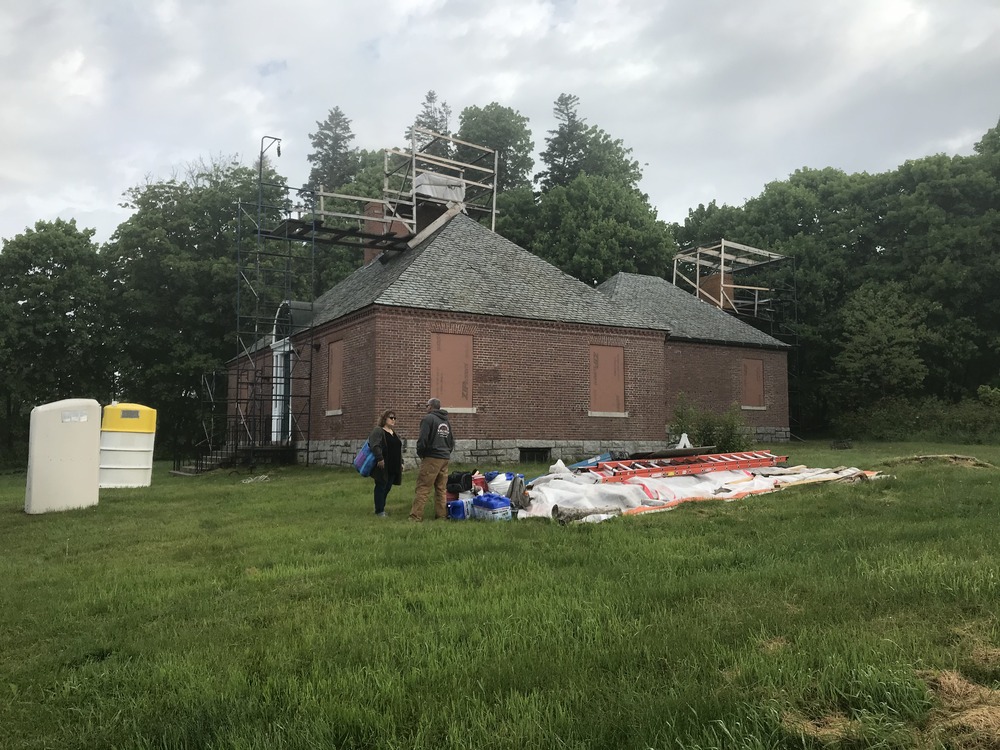 Two large structures protect the chimney and shutters are closed, portable toilets are outside the building, and building materials on the grass.