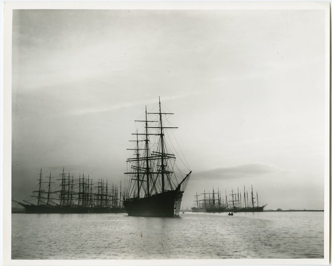 View includes a "forest" of masts in the background. Additional information included inside the print enclosure: [CR]"Like barren trees, the fleet of seasoned old State-of-Mainers that wintered in Oakland Creek looked forward to April. If they were fortunate enough to secure a charter from the Alaska Packers Association, April was usually the month that found them blossoming with sail once again outside the Golden Gate.[CR]In the early years of the century, the Alaska Packers owned comparatively few ships, and usually chartered at least half of its fleet from the laid up fleet in the Creek. Wooden downeasters predominated in the early years of the trade; only seven of the twenty-four square-riggers in the 1902 fleet were of iron or steel construction. In another decade the famous "Star" fleet was largely assembled, outnumbering the earlier wooden ships, and dominating the trade until the first steamer was bought by the company in 1925. The last two vessels to go north under sail, STAR OF ALASKA and STAR OF HOLLAND, made their final voyage in 1929. In all, the company had owned nineteen vessels with the "Star" prefix, all of iron or steel construction."