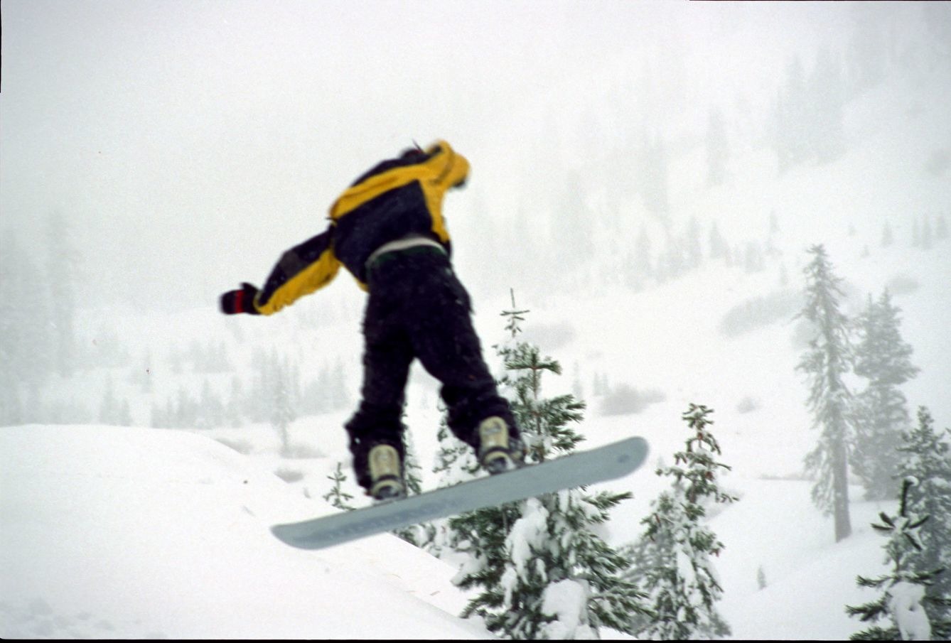 A snowboarder up in the air with snow and trees in the background in the Southwest part of the park.