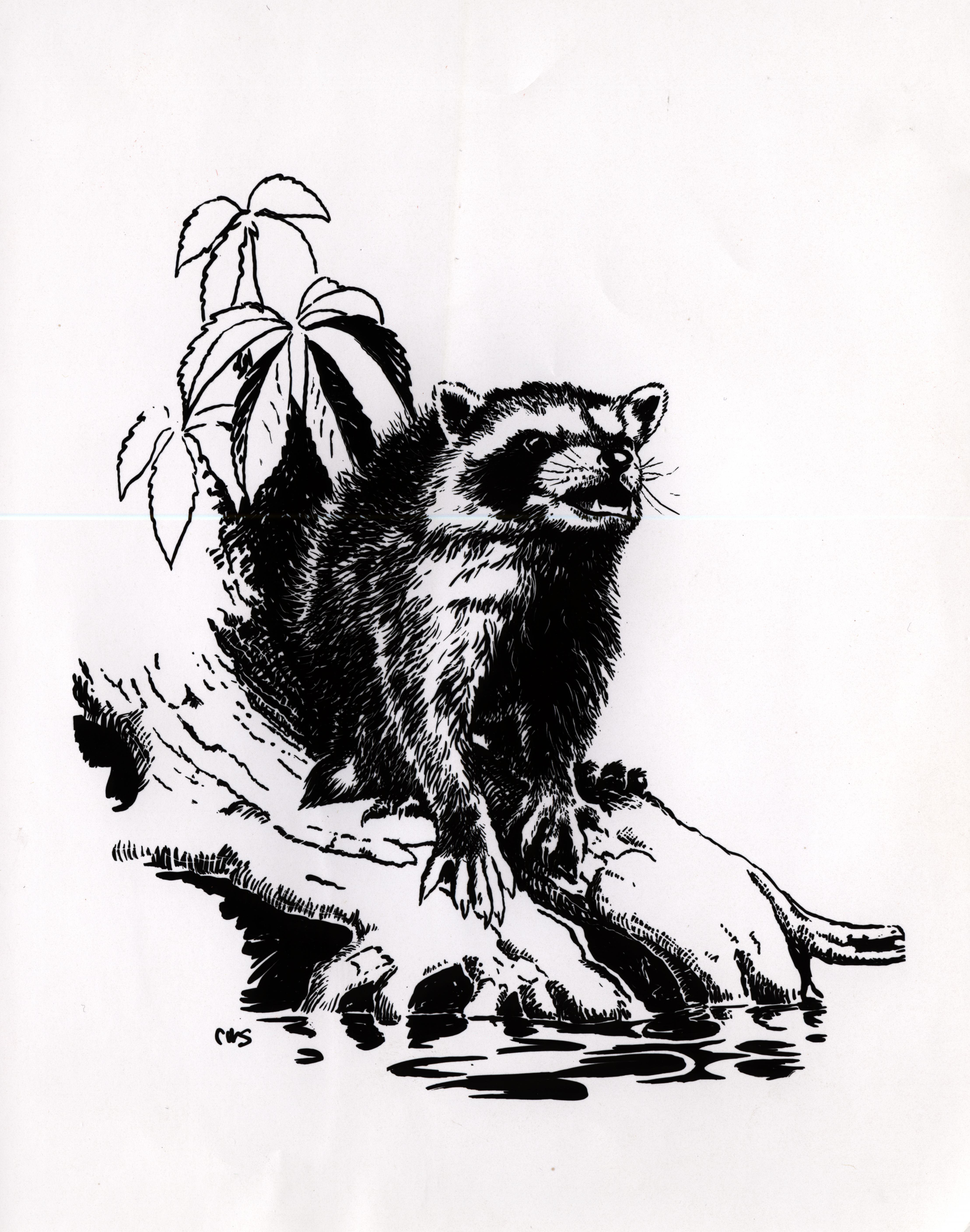 Engraving of a Charles Schwartz drawing of a young raccoon. ; 1930s-1990s