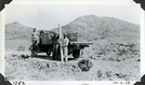 Three unidentified men with truck installing concrete fence posts, unknown location at Death Valley Ranch. October 2, 1928. Photographed by Mat Roy Thompson.