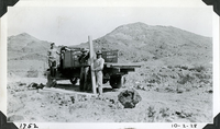 Three unidentified men with truck installing concrete fence posts, unknown location at Death Valley Ranch. October 2, 1928. Photographed by Mat Roy Thompson. Posts on ground in front of them. Inscription in black ink on lower left corner referring to historic photograph number system: 1752; date in lower right corner: 10-2-28. Black and white, 3x5 inch, horizontal format. Corner mounted in photograph album.
