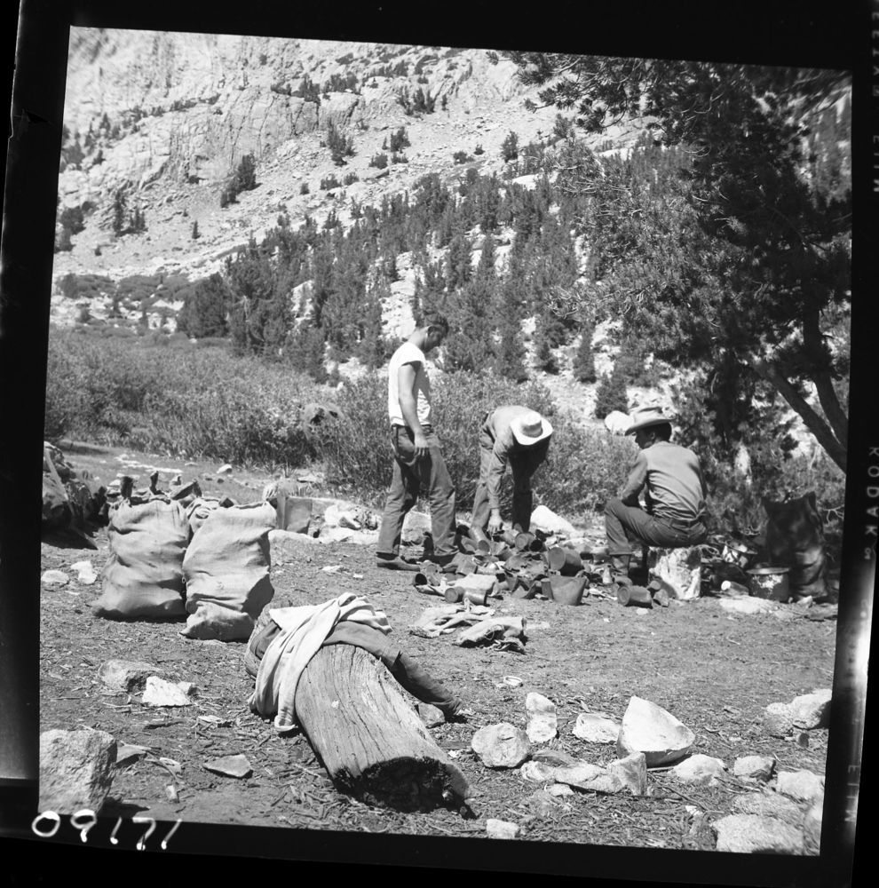 unknown photographer, 600800, Rae Lakes, KCNP, Backcountry cleanup, Smashing and sacking cans.