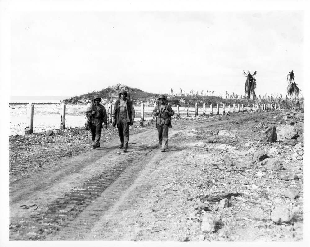 Three Marines walk along a seashore road at Chonito Cliff with Adelup Point shown in background. The wrecked house on the summit can be seen. The entire rocky point is honey combed with caves in which the Japanese were still hiding when this picture was taken. It took a day to smoke them out from the inner recesses.
