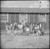 Low fifth grade pupils and their teacher, Mrs. Rhoda McGarve, outside their barracks school room
