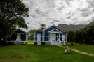 Two teal buildings with white doors and framing and a darker, shingled roof.