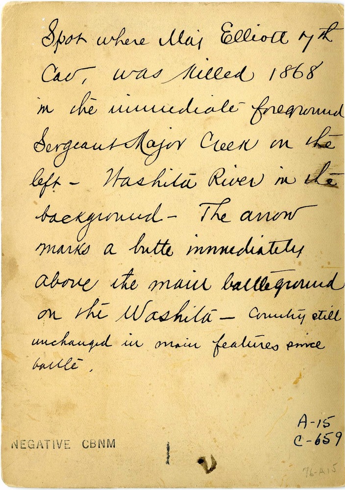 LIBI_00015_00659; A mounted photograph of view of site where Major Joel H. Elliot and 17 men were cut off and slain on November 27, 1868; image has pink-tone; produced and identified by Hugh L. Scott, 7th cavalry, circa 1890; with handwritten ink notation on verso of print.; print, photographic [mounted on card];Courtesy of the National Park Service, Little Bighorn Battlefield National Monument, LIBI_00015_00659, Hugh L. Scott, "Site Where Major Joel Elliot and Seventeen Soldiers were Slain on November 27, 1868," circa 1890