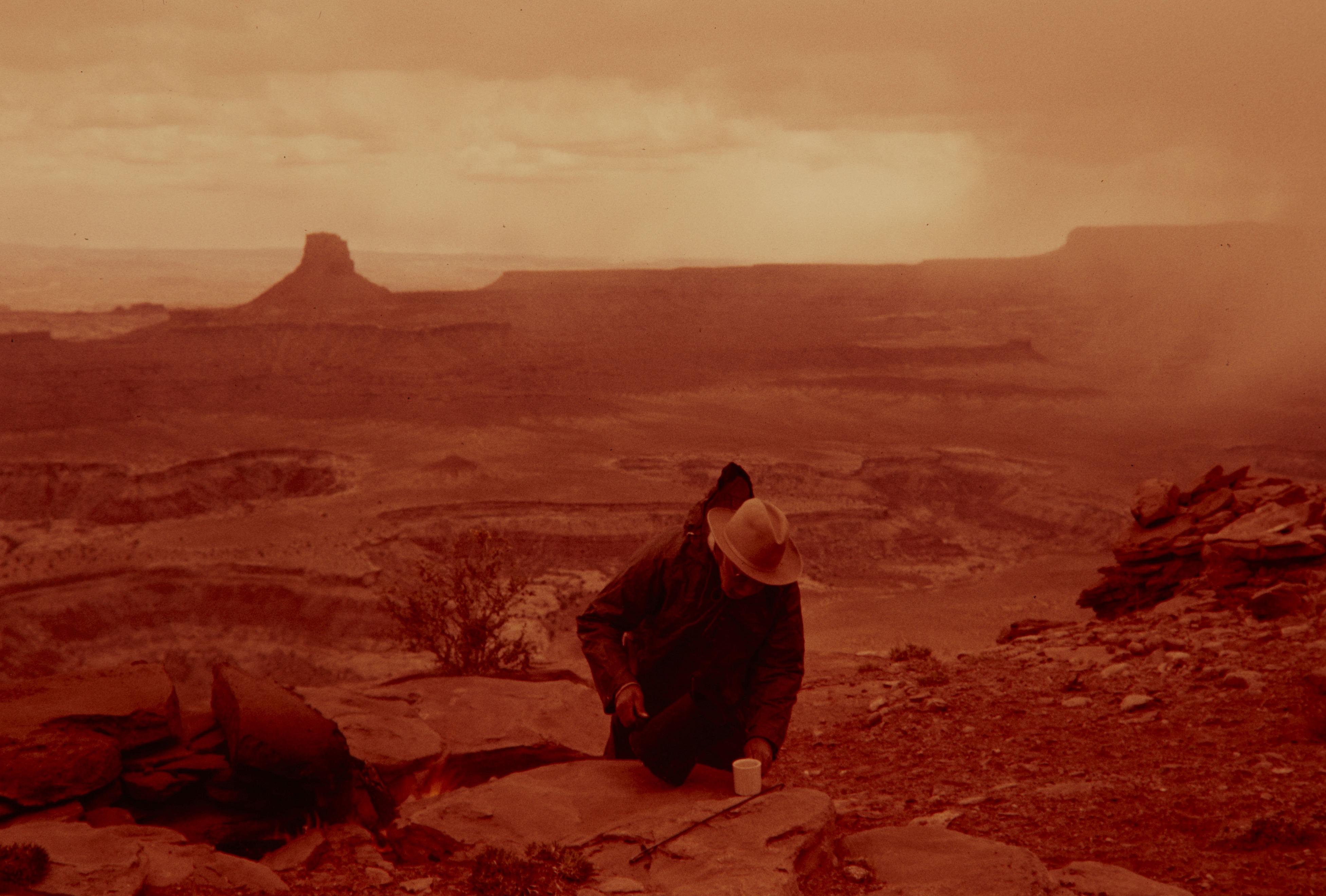 Frank Masland pouring coffee into a mug at Pamorama Point in Canyonlands National Park.