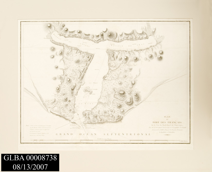 18'th century engraved map of GLBA region titled, "Plan de Port des Francais," by La Perouse, Jean-Francois de Galaup, comte de, 1741-1788. Based on a 1786 trip to region.