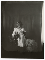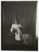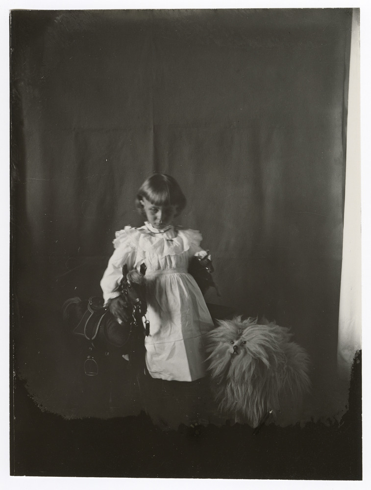 Young Amy in a white dress puts her right arm around a rocking horse and holds a horse statue in her left arm. A shaggy toy dog stands next to her. She looks down. Notes: C1892-C1895 based on the subject's apparent age. Identified as Amy by Frances Wetherell. A modern non-archival print developed for Mrs. Arthur Brooks is in an accompanying envelope.