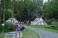 Seated and standing visitors near white birch bark lodges.