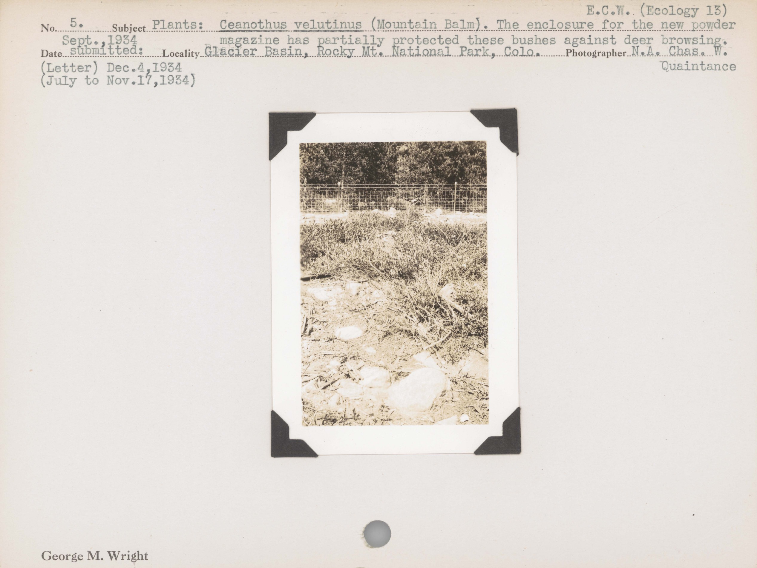 Plants--Ceanothus velutinus (Mountain Balm). The enclosure for the new powder magazine has partially protected these bushes against deer browsing. Locality: Glacier Basin, Rocky Mountain National Park, Colorado . Negative #: ecw13 (Ecology 13). [Emergency Conservation Work]. Submitted: (Letter) December 4, 1934 (July to November 17, 1934)