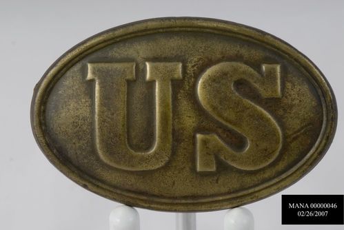 U.S. CARTRIDGE BOX PLATE. 2 WIRE ATTACHMENT LOOPS (1 BENT) ON LEAD FILLED BACK.