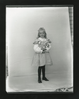 A young white girl stands in front of a backdrop. She holds a small white doll in her arms.