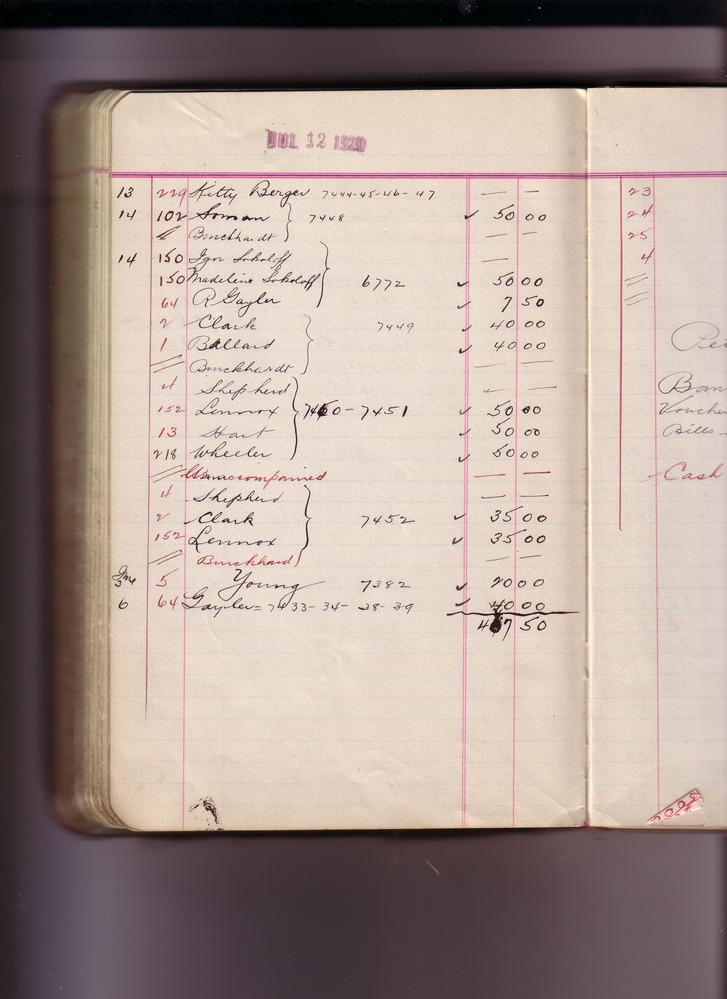 Some of the markings made in pencil in these cash books were made by ENHS Curator Leah Burt during the 1970s and/or early 1980s. For Leah Burt handwriting examples see pages for: December 19, 1921 (cash book 17) ; February 12, 1923 (cash book 17) ; October 27, 1924 (cash book 18) ; December 01, 1925 (cash book 19).