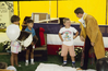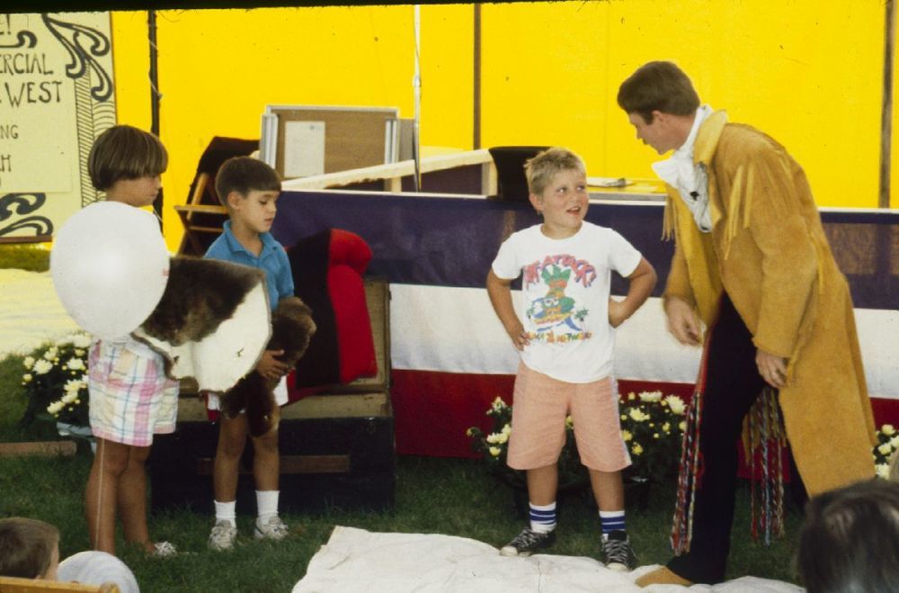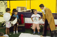 Man in a long coat speaking to young visitors. ; June 1988