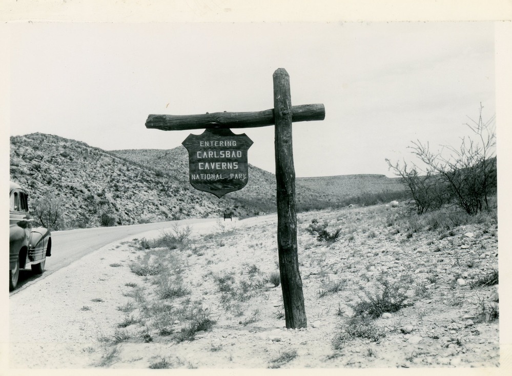 A black and white photograph of a wooden sign constructed on the side of the road, welcoming visitors to Carlsbad Caverns National Park.