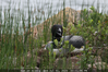 With blue lake waters churning in the background, a bird with a long bill, red eye and black and white markings huddles on a nest between low shrubbery, grass, and several pink, granite boulders