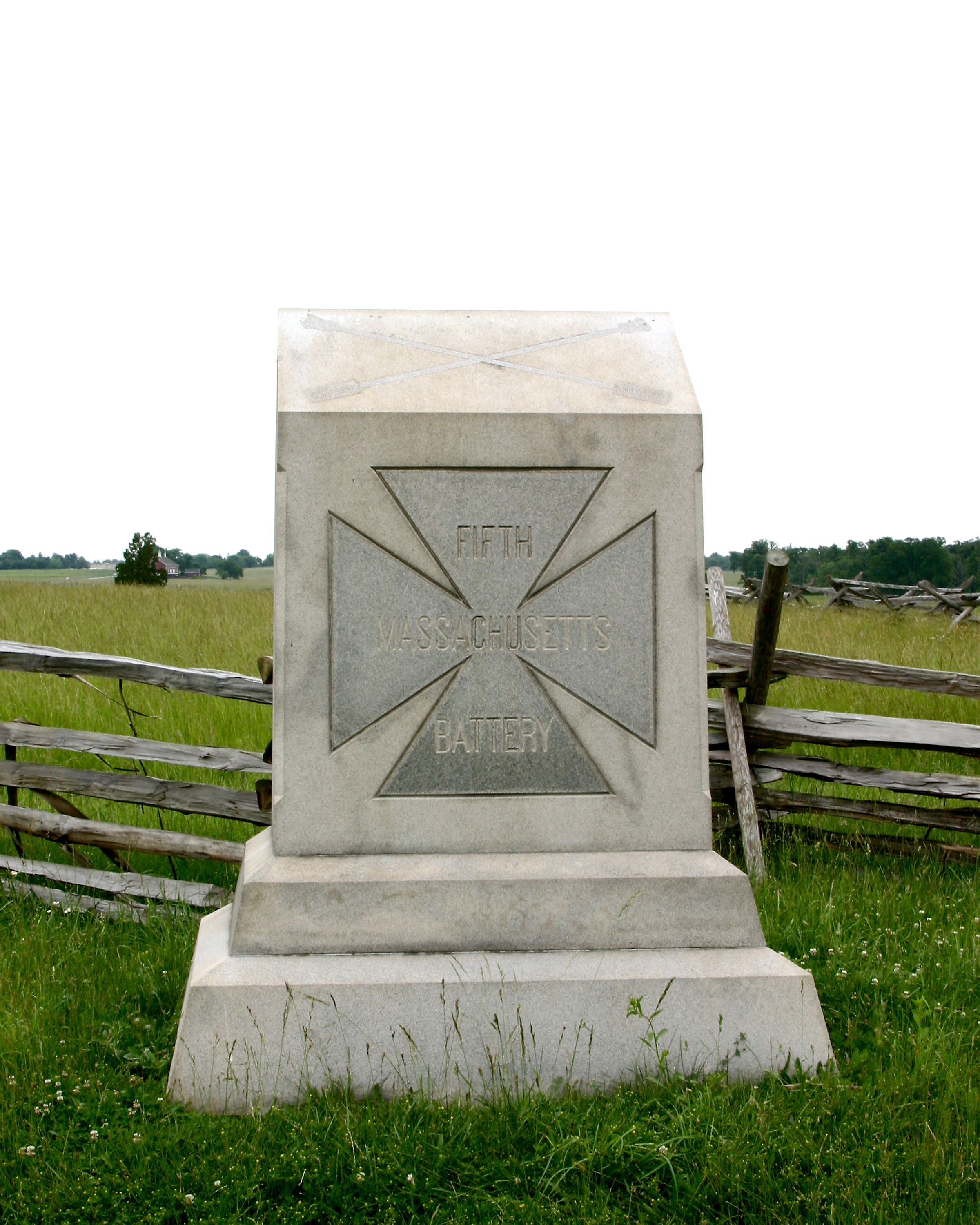 1 of 25 on Park honoring troops from MA. Marks position held by 5 MA Battery on pm of July 2, 1863 where they shelled Confederates near Rose Farm Building & Woods. Located on N of Wheatfield Rd near junction w/ Sickles Ave at Excelsior Field. || MN & 2 cannons. Base, 5'6"x4'7", shaft, 4'x3', 7'3" high. Gable toped w/ chamfered edges. Polished Maltese cross w/ inscription on S, E, W sides. Polished inscription of crossed rammers on front slant of top.
