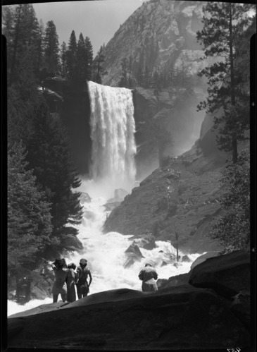 Vernal Fall with 3 girls in foreground. Left to right: Dorothy Valente, Anne Vernetti, Bee Gonella.