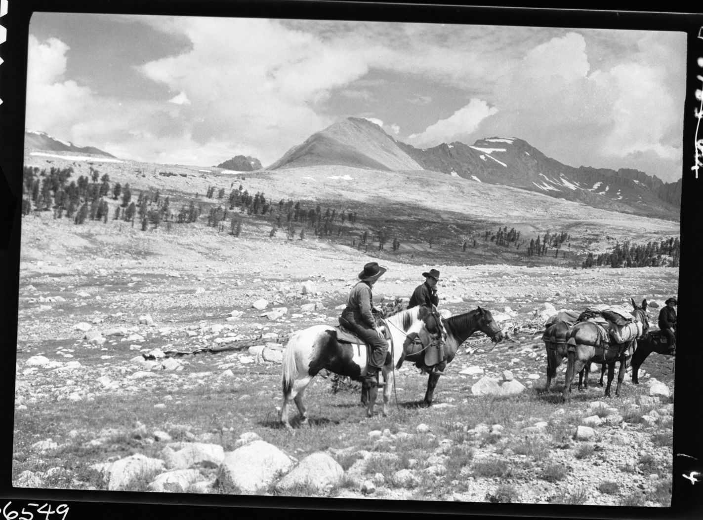 Lowell Sumner, 361009, Bighorn Plateau, SNP, stock use, north toward Diamond Mesa. 2 negative panorama, right panel. Individuals unidentified.