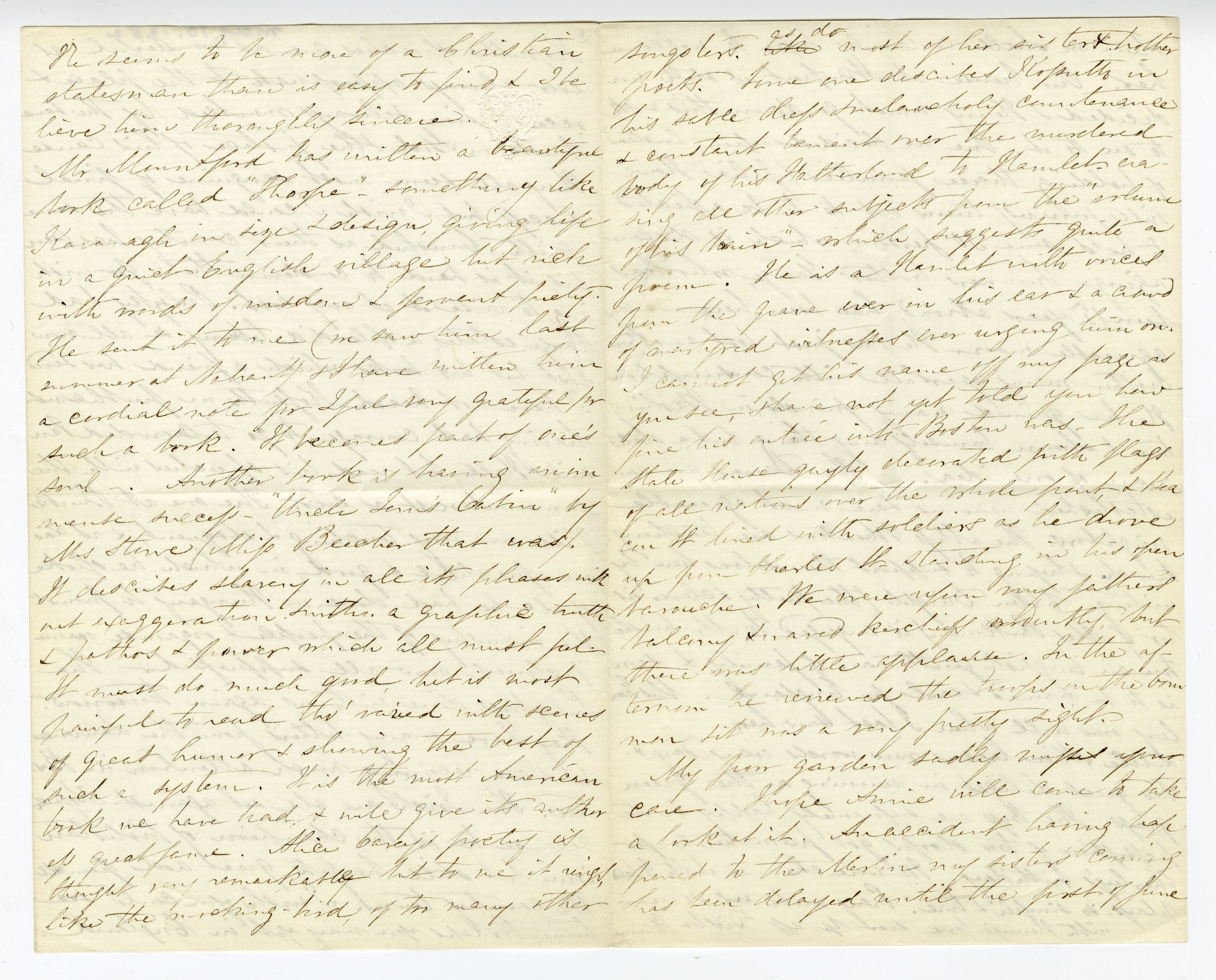 Another book is having immense success – “Uncle Tom’s Cabin” by Mrs Stowe (Miss Beecher that was). It describes slavery in all its phases without exaggeration & with a graphic truth & pathos & power which all must feel. It must do much good, but is most painful to read, tho’ varied with scenes of great humor & showing the best of such a system. It is the most American book we have had & will give its authoress great fame. Alice Cary’s poetry is thought very remarkable but to me it rings, like the mocking-bird, of too many other [p. 7] songsters. [crossed out: like] as do most of her sister & brother poets. Some one describes Kossuth in his sable dress & melancholy countenance & constant lament over the murdered body of his Fatherland to Hamlet – erasing all other subjects from the “volume of his brain” – which suggests quite a poem. He is a Hamlet with voices from the grave ever in his ear & a crowd of martyred witnesses ever urgin him on. I cannot get his name off my page as you see, & have not yet told you how fine his entrée into Boston was – The State House gayly decorated with flags of all nations over the whole front, & Beacon St lined with soldiers as he drove up from Charles St. standing in his open barouche. We were upon my father’s balcony & waved kerchiefs ardently, but there was little applause. In the afternoon he reviewed the troops on the Common & it was a very pretty sight.