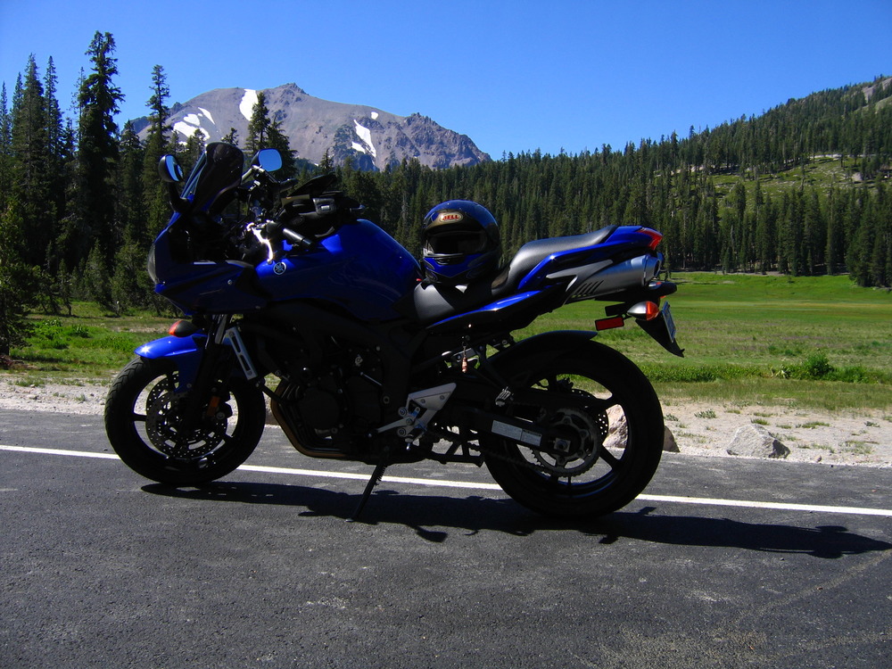 A shiny blue motorcycle parked at the side of the road next to a grassy meadow with Lassen Peak rising above.